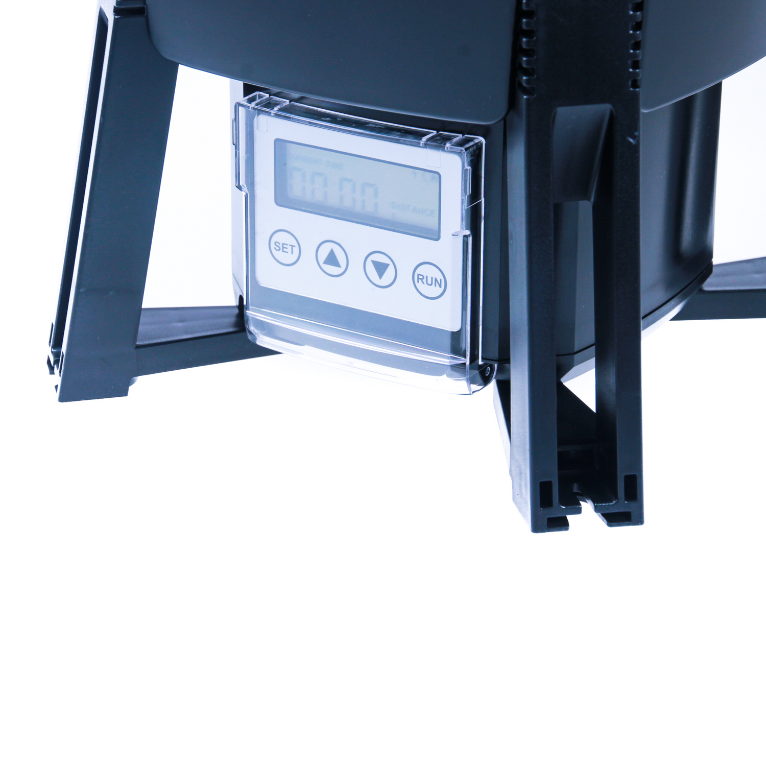 Chaque étang est différent et chaque exigence alimentaire des poissons pour un étang est différente. Le BluFeeder contient de nombreuses options de réglage via le panneau de commande facile à utiliser. Vous pouvez entièrement définir la fréquence à laquelle vous souhaitez nourrir les poissons par jour, jusqu'à 6 fois par jour. Vous pouvez également définir la distance à laquelle la mangeoire à poisson doit jeter la nourriture. La portée peut être réglée sur 1, 2 ou 3 mètres. De cette façon, vous pouvez ajuster la portée à la taille de votre bassin. La quantité pour chaque cycle peut également être définie. Vous pouvez indiquer le temps d'alimentation entre 1 et 20 secondes. De cette façon, vous pouvez adapter l'ensemble du régime alimentaire au régime alimentaire de vos poissons.